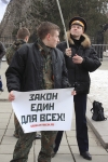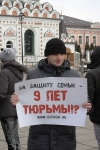 Несколько человек пришли с плакатами: "За защиту семьи — девять лет тюрьмы?!", "Закон един для всех!", "Требуем справедливости для Евгения Стригина!".