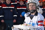 Сотрудники МЧС поздравили юных хоккеистов со спортивным праздником, пожелали им дальнейших успехов в спорте и подарили сладкие подарки.