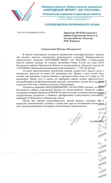 Саратовский региональный штаб движения посчитал, что данная закупка не отвечает курсу лидера ОНФ, президента России Владимира Путина на импортозамещение, о чем проинформировал директора Пугачевского МУП "Кадастр".