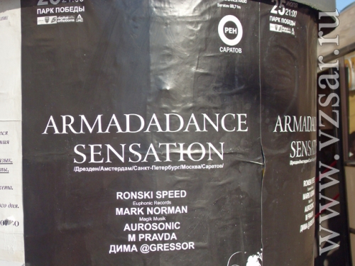 В конце июля реклама мероприятия "Armadadance Sensation" появилась в Интернете – на Саратовских форумах, социальных сетях и на официальном сайте мероприятия. Позже реклама появилась и в эфире местных радиостанций, а теперь по городу расклеены афиши с рекламой этого "оупен-эйра". На мероприятии обещают быть звезды мировой диджей-сцены формата транс», а так же невероятный перфоманс, стриптиз и грандиозное шоу на оборудовании и сцене не знающем аналогов в Саратове". А место проведения преподносится как эксклюзивное! Такая реклама вызвала негодование в Интернет-сообществе по поводу места проведения дискотеки – Парка Победы и мемориального комплекса Журавли. Однако организаторы словно не слышат отзывы и критику в свой адрес, продолжая рекламировать свою "глобальную ночную вечеринку". По всему городу уже несколько дней свободно развешаны афиши с указанием места проведения "Парк Победы" на Соколовой горе", продаются билеты – цены колеблются от 500 до 50000 рублей. Обещают вип-зоны с отдельным вип-сервисом, элитным алкоголем и т.д. Количество планируемой публики обещают в пределах 8000 человек.