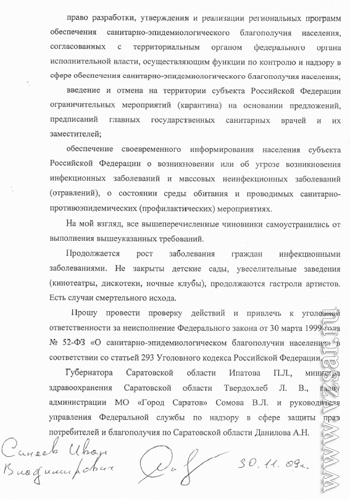 Прошу провести проверку действий и привлечь к уголовной ответственности за неисполнение Федерального закона от 30 марта 1999 года № 52-ФЗ "О санитарно-эпидемиологическом благополучии населения" в соответствии со статьей 293 Уголовного кодекса Российской Федерации губернатора Саратовской области Павла Ипатова, министра здравоохранения Саратовской области Ларисы Твердохлеб, главу администрации Саратова Вячеслава и руководителя управления Федеральной службы по надзору в сфере защиты прав потребителей и благополучия по Саратовской области Алексея Данилова", говорится в заявлении.