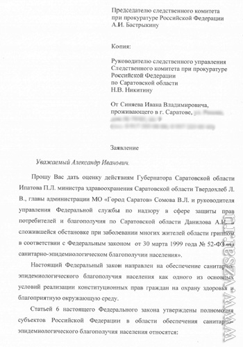 Житель Саратова Иван Синяев написал заявление на имя председателя СКП РФ Александра Бастрыкина (копия направлена руководителю СУ СКП РФ по Саратовской области Николаю Никитину), которое сегодня оказалось в распоряжении ИА "Взгляд-инфо".