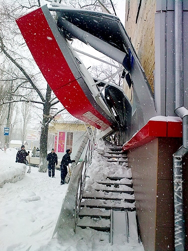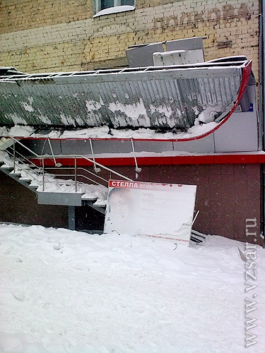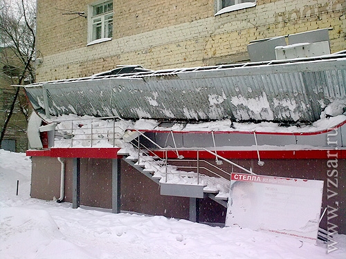 Сегодня утром на пересечении улиц 2-Садовая и Большая Садовая рухнул козырек на входе в стоматологическую клинику "Стелла". Навес не выдержал тяжести выпавшего снега.