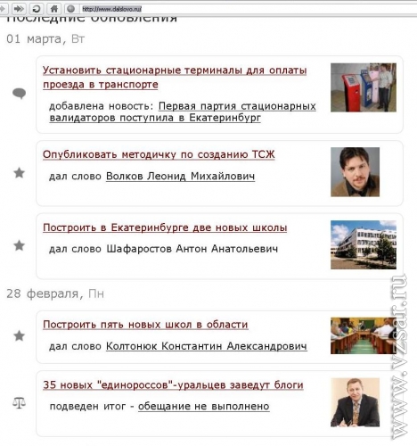 В Интернете появился новый проект DalSlovo.ru – мониторинг обещаний политиков. Как сообщил один из создателей портала независимый депутат Екатеринбургской городской думы Леонид Волков, "этот проект веб-два-нольный до мозга костей: вы сами заносите в него обещания политиков и общественных деятелей, сами помогаете отслеживать их выполнение, сами добавляете пруфлинки и уточнения, сами помогаете следить за развитием сюжетов".