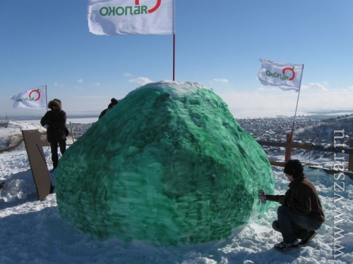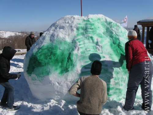 Для празднования Масленицы к въезду на Кумысную поляну прибыли около 10 партийцев, столько же студентов вузов и активистов-экологов. Присутствующие соорудили гору из снега в виде яблока и покрасили ее в зеленый цвет.