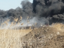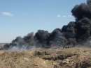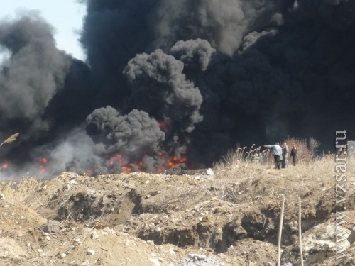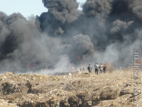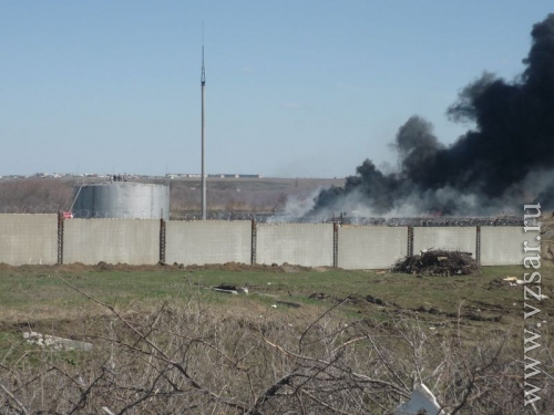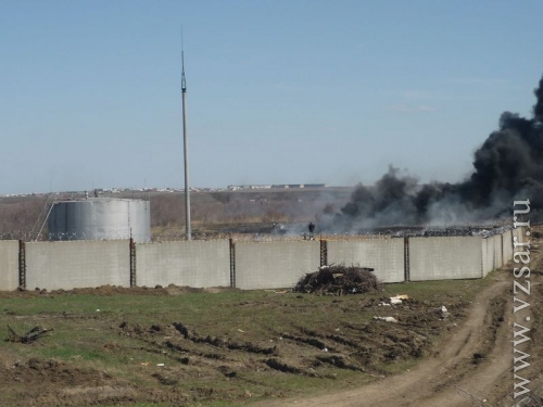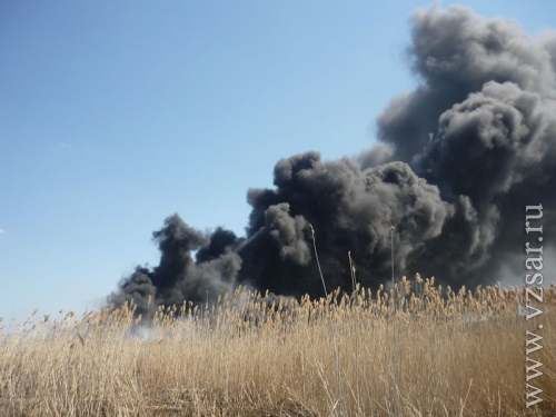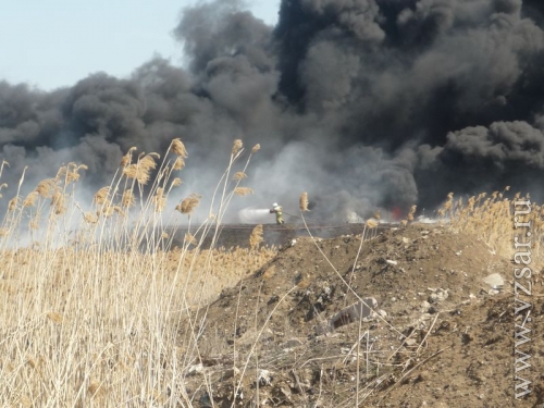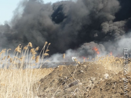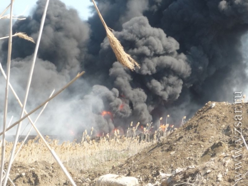Наш корреспондент передает с места события, что огонь приближается к расположенной рядом нефтебазе. Площадь пожара составляет около 150 кв.м.