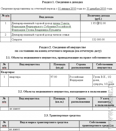 В частности, господин Гусев задекларировал доход в сумме 1 млн. 951 тыс. 952 руб., его супруга – 1 млн. 320 тыс. рублей. В их совместной собственности находится квартира площадью 97 кв. м. Личного транспорта и земельных участков Гусевы не имеют.