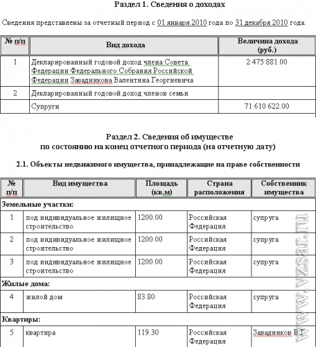 Члены Совета Федерации РФ от Саратовской области Владимир Гусев и Валентин Завадников обнародовали данные о своих доходах за 2010 год.