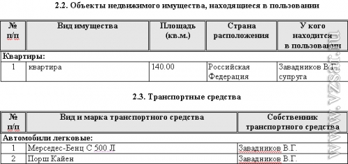 Завадников владеет квартирой площадью 119,3, а также автомобилями "Порш Кайен" и "Мерседес-Бенц С 500". В собственности его супруги находятся три земельных участка, каждый площадью 1200 кв. метров и жилой дом площадью 83,8 кв. метра. Также в совместной собственности Завадниковых числится еще одна квартира (140 кв. метров).