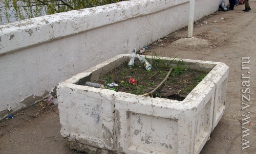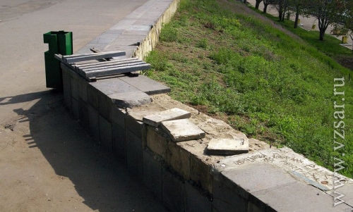 Переполненные мусорные баки, отсутствующие заграждения, разрушенные парапеты, наскоро залепленные цементом и "дербентским камнем", незаконные постройки, расписанные граффити стены, разломанные скворечники на оставшихся деревьях – вот неполный список "радостей", ожидающих на Набережной Космонавтов саратовцев", - пишет господин Шараев в комментариях к присланным фото.