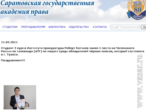 В новостной ленте на сайте вуза в сообщении от 11 мая отмечается, что Катчиев занял 1 место на Чемпионате России по таэквондо (ATF) по мацоги среди обладателей черных поясов. Турнир состоялся в Туапсе.