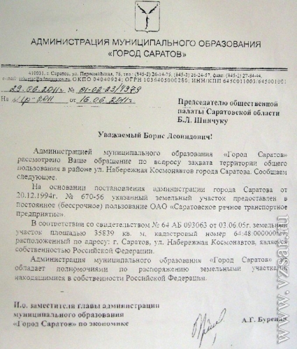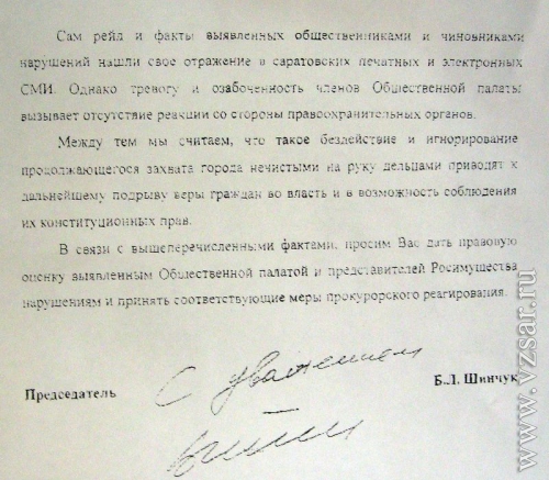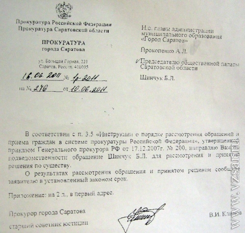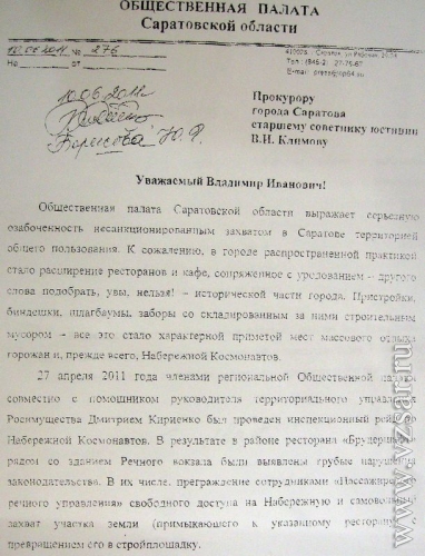 ИА "Взгляд-инфо" уже сообщало о бездействии прокурора Саратова Владимира Климова по поводу захвата Набережной Космонавтов. Предлагаемые ниже документы свидетельствуют о том, что он не только игнорирует вопросы журналистов, но и не желает реагировать на обращения Общественной палаты.