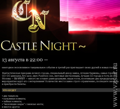 Как отмечается на официальном сайте мероприятия в Интернете, это будет "незабываемая ночь на фантастической панораме ночного города в самом настоящем и таинственном замке".