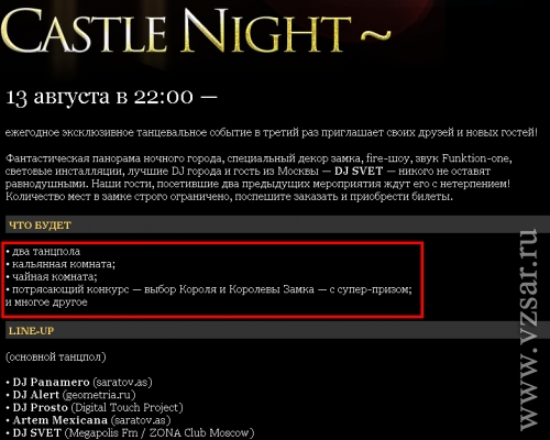 Напомним, ночью 13 августа в культурно-этнографическом комплексе "Национальная деревня" планируется проведение развлекательного шоу. Организаторы обещают "специальный декор замка, известных барменов, самые горячих GO-GO девушек, fire-шоу, звук Funktion-one, световые инсталляции, лучших DJ города и гостя из Москвы — DJ SVET". В списках развлечений также значатся "веселящие шары".