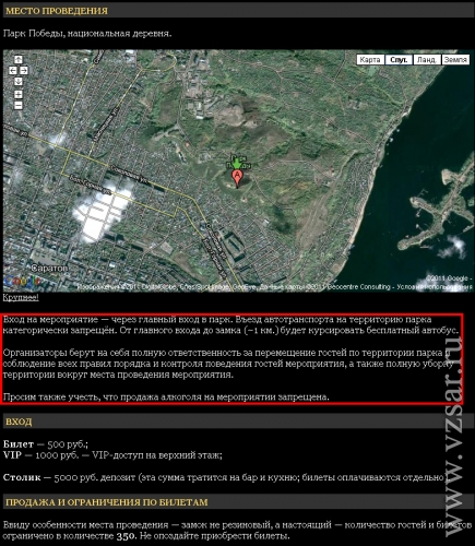 Отметим, что сегодня на официальном сайте мероприятия в разделе "Что будет?" исчез пункт о "веселящих шарах" с закисью азота. Кроме того, появилась информация следующего содержания: "Вход на мероприятие - через главный вход в парк. Въезд автотранспорта на территорию парка категорически запрещён. От главного входа до замка (~1 км.) будет курсировать бесплатный автобус. Организаторы берут на себя полную ответственность за перемещение гостей по территории парка и соблюдение всех правил порядка и контроля поведения гостей мероприятия, а также полную уборку территории вокруг места проведения мероприятия. Просим также учесть, что продажа алкоголя на мероприятии запрещена".