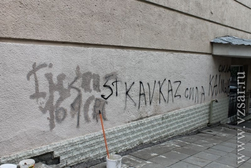 Сегодня утром работники саратовского театра кукол "Теремок" обнаружили на стенах учреждения надписи, нанесенные неизвестными вандалами. К моменту прибытия на место корреспондента "Взгляда-инфо" рабочие закрашивали слова "Kavkaz сила" и "Калмык сила".