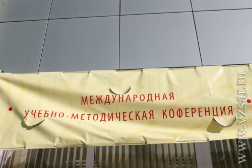Рекламная растяжка висит на главном корпусе вуза, расположенном на углу проспекта Кирова и улицы Радищева, и приглашает к участию в учебно-методической "коФеренции".