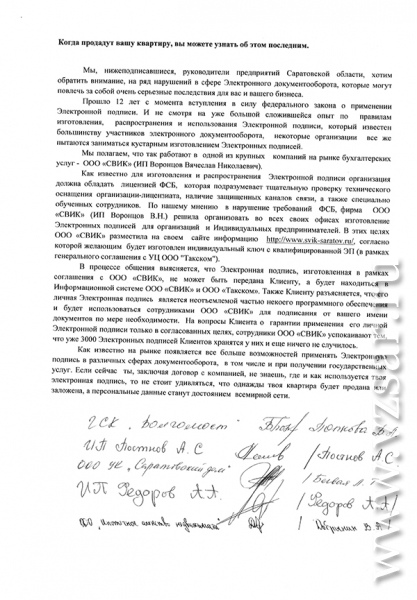 "Как известно, для изготовления и распространения Электронной подписи организация должна обладать лицензией ФСБ, которая подразумевает тщательную проверку технического оснащения организации-лицензиата, наличие защищенных каналов связи, а также специально обученных сотрудников. По нашему мнению, в нарушение требований ФСБ фирма ООО "СВИК" (ИП Воронцов В.Н.) решила организовать во всех своих офисах изготовление Электронных подписей для организаций и индивидуальных предпринимателей. В этих целях ООО "СВИК" разместило на своем сайте информацию, согласно которой желающим будет изготовлен индивидуальный ключ с квалифицированной ЭП (в рамках генерального соглашения с УЦ ООО "Такском").
