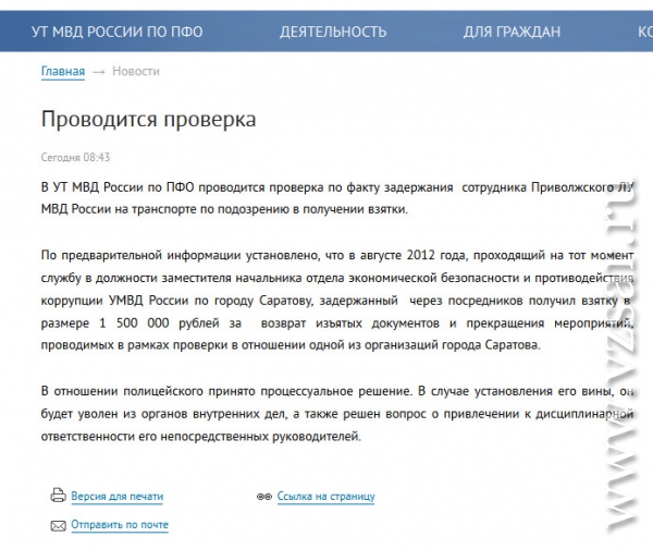 УТ МВД России по ПФО обнародовало некоторые подробности задержания сотрудника саратовской полиции.