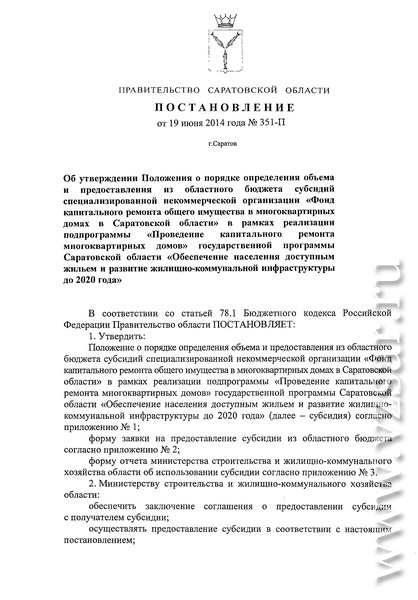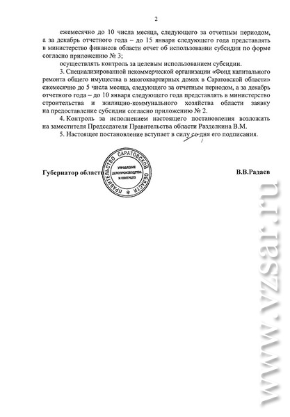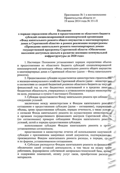 В частности, губернатор области Валерий Радаев подписал постановление под названием (приводится дословно) "Об утверждении положения о порядке и условиях предоставления государственной поддержки на проведение капитального ремонта общего имущества в многоквартирных домах в форме субсидии бюджетам муниципальных районов, городских округов и поселений области на обеспечение мероприятий по капитальному ремонту многоквартирных домов из областного бюджета, за счет средств, поступивших от государственной корпорации - Фонда содействия реформированию жилищно-коммунального хозяйства, и средств, предусмотренных в областном бюджете на долевое финансирование проведения капитального ремонта многоквартирных домов, расположенных на территории Саратовской области".