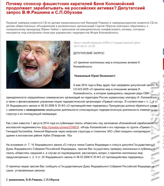 Экс-глава Саратовского обкома КПРФ, депутат Госдумы Валерий Рашкин подготовил очередной запрос в Генпрокуратуру РФ по поводу бизнеса украинского олигарха Игоря Коломойского.