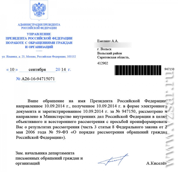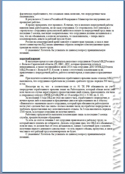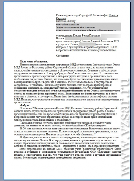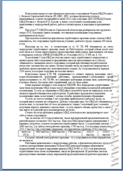 Адвокат Емелин в письме на имя лидера страны добавляет: "В настоящее время ко мне обратилось несколько сотрудников Отдела МВД России в г. Вольске Саратовской области, ДЧ, ИВС, ДПС, которые предпочли остаться неназванными, а также уволившийся в июне 2014 года сотрудник ДПС ОГИБДД Отдела МВД России в г. Вольске Р.П. Куклев, в связи с отсутствием компенсации за их привлечение к сверхурочной работе, работе в ночное время, в выходные и праздничные дни.