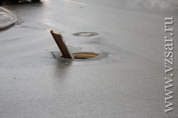 "Какой-то сердобольный саратовец решил даже предупредить возможное попадание в яму автомобильного колеса. Он предусмотрительно вставил в люк доску. Но даже это обозначение делает препятствие малозаметным. Автомобилисты рискуют попасть в ДТП и получить травмы.