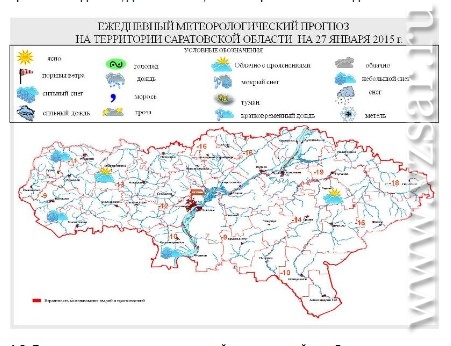 Ветер юго-восточный 6-11 м/с, местами порывы до 14 м/с. Температура ночью -14...-19°, при прояснении до -22…-27°, днем -9...-14°, в Левобережье местами до -19°.