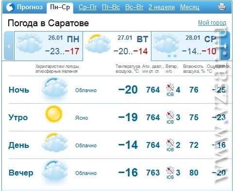 По данным портала Гисметео.ру, сегодня днем в Саратове ожидается переменная облачность. Температура воздуха утром составит – 19°, днем воздух прогреется до -14° при юго-восточном ветре 2-3 м/с.