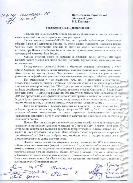 По имеющимся у нас сведениям, речь шла о выделении министерством молодежной политики, спорта и туризма Саратовской области 4 миллионов рублей (по 2 миллиона во втором полугодии 2014 года и первом полугодии 2015). Была надежда и на Ваше содействие (пусть и не в объемах прошлого сезона). Однако в 2014 году было получено всего 1,3 миллиона рублей (на 700 тыс. рублей меньше запланированного), на 2015 год средства на мини-футбол по непонятным причинам вообще не заложены (хотя бюджет будет финансировать команды, выступающие в более низких лигах, с меньшим числом болельщиков, с минимальным количеством саратовцев в составе).
