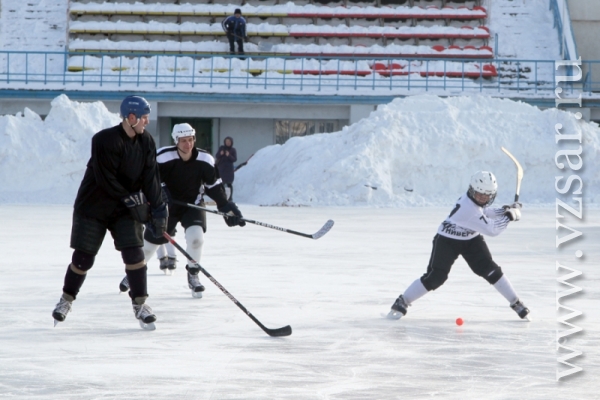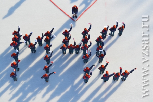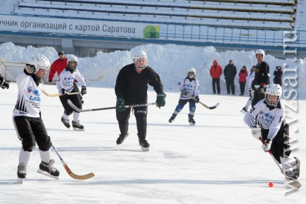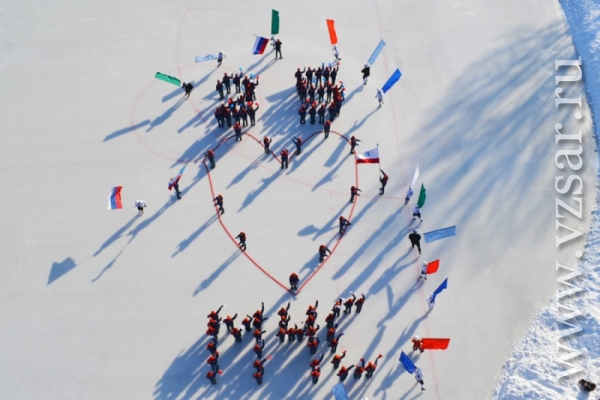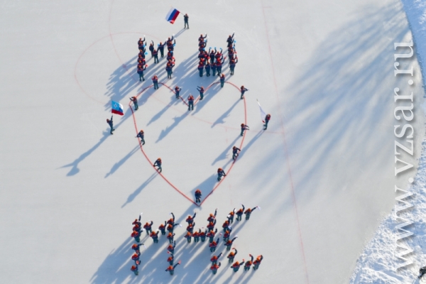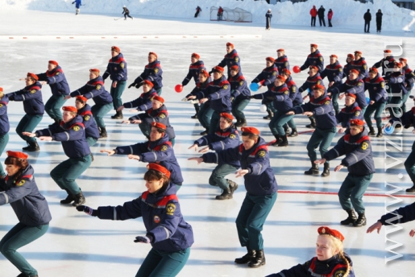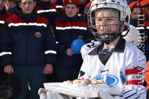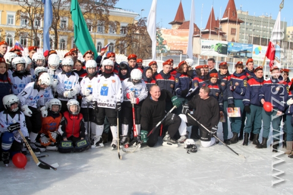 За считанные минуты собравшиеся на стадионе построили фигуру в виде бьющегося сердца. После чего состоялся товарищеский хоккейный матч между командой ГУ МЧС и командой "Универсал" детско-юношеской спортивной школы "Надежда губернии". Ребята этой команды хоть и подростки, но уже не первый год профессионально занимаются хоккеем и имеют успехи на Российском уровне.