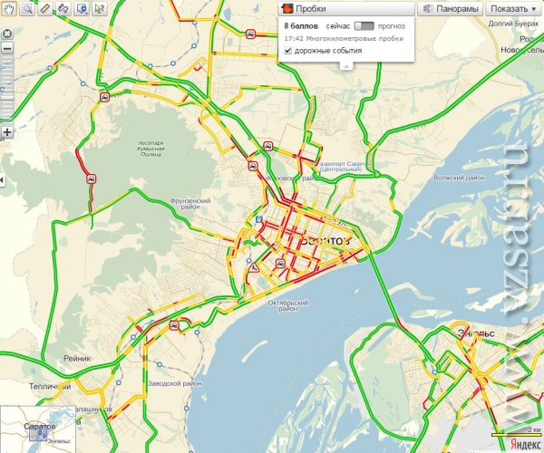 В Саратове сервис "Яндекс. Карты" зафиксировал многокилометровые пробки. В настоящее время заторы достигают восьми баллов из десяти возможных.