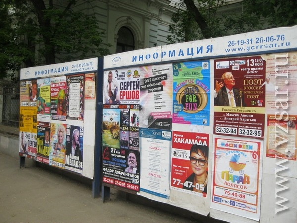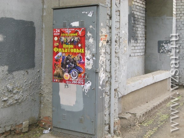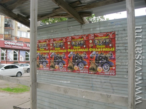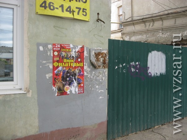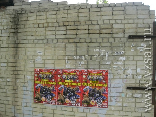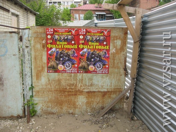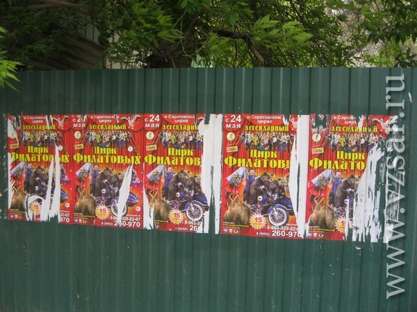 На фасадах зданий и заборах в Октябрьском районе Саратова расклеены рекламные плакаты выступления Цирка Филатовых, запланированного на 24 мая. О нарушении правил благоустройства ИА "Взгляд-инфо" рассказали в администрации района.