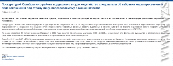 В декабре 2012 года ООО "ДСК-28" заключило ряд договоров на выполнение работ по строительству и реконструкции детских садов в Балашове. С 19 по 27 декабря 2012 года на расчетный счет ООО были перечислены денежные средства в сумме 39 миллионов 562 тысяч 434 рублей.