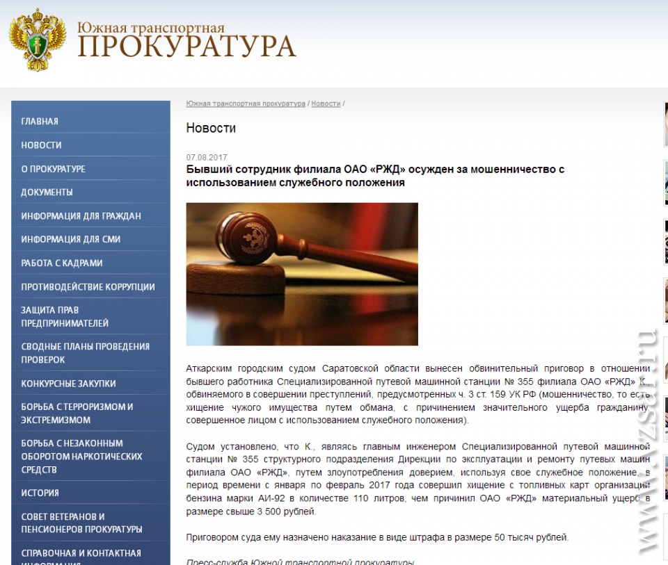 Аткарский городской суд Саратовской области огласил приговор в отношении бывшего работника Специализированной путевой машинной станции № 355 филиала ОАО "РЖД".