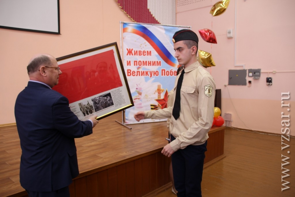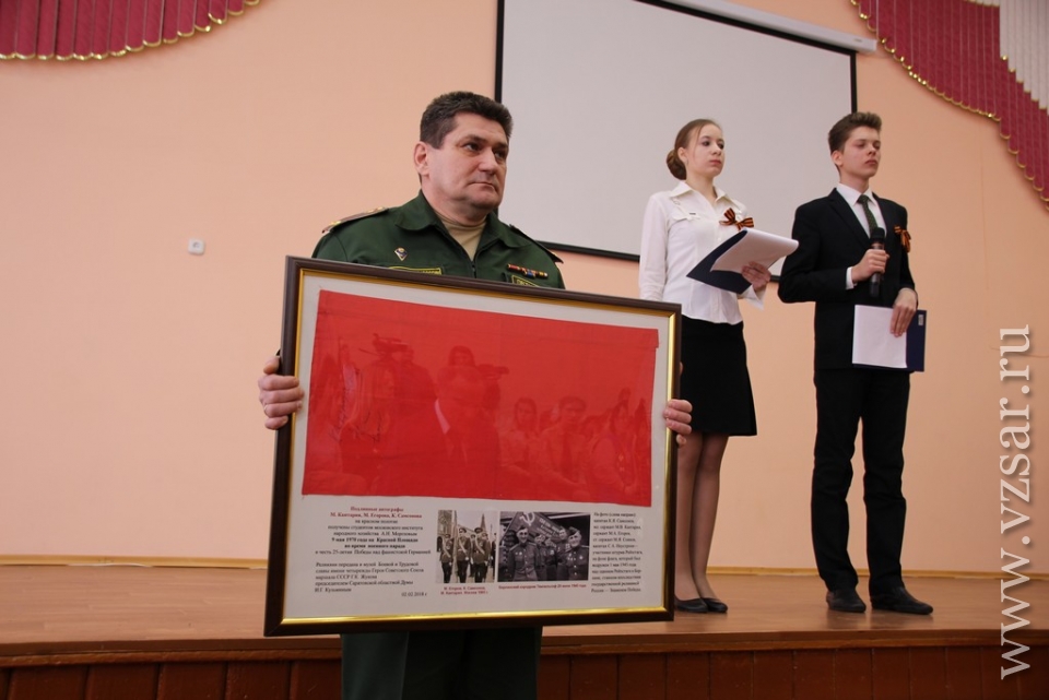 Иван Кузьмин передал на хранение школьному музею имени Георгия Жукова историческую реликвию - копию Знамени Победы с автографами легендарных героев Михаила Егорова и Мелитона Кантарии, водрузивших в мае 1945-го красный флаг над рейхстагом.
