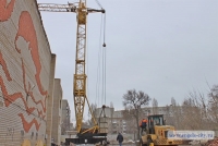 На объекте установлен башенный кран. Как сообщил представитель организации-подрядчика рабочие ведут подготовку к снятию плит перекрытия верхнего этажа здания. Снят старый мягкий кровельный материал, керамзит, асфальтовое покрытие, старая стяжка.