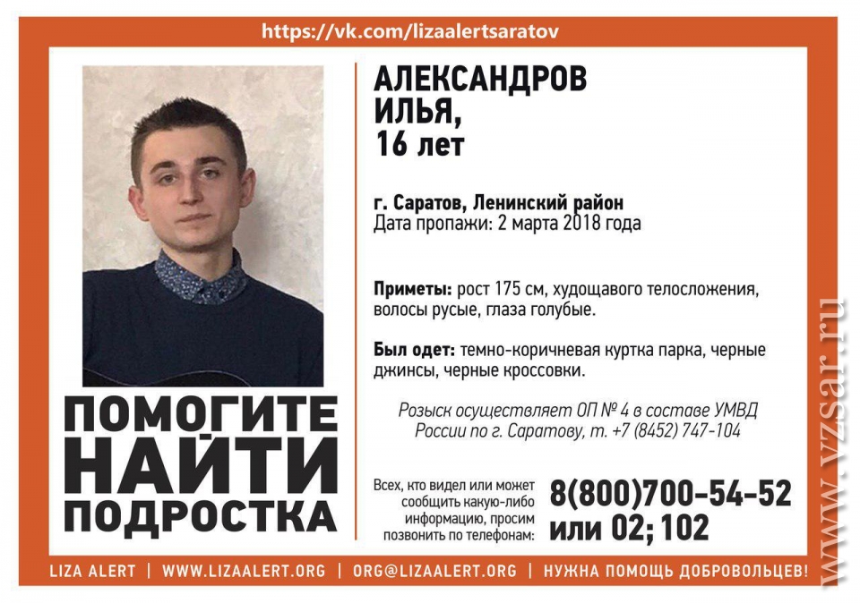 Всех, кто знает, где находится Илья Александров, просят обращаться по телефонам 8-800-700-54-52 или 02 (с мобильного 102).