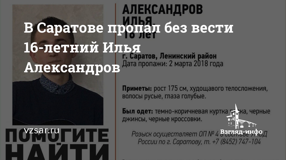 Приметы: рост 175 см, худощавого телосложения, волосы русые, глаза голубые. В момент пропажи был одет: темно-коричневая куртка парка, черные джинсы, черные кроссовки.