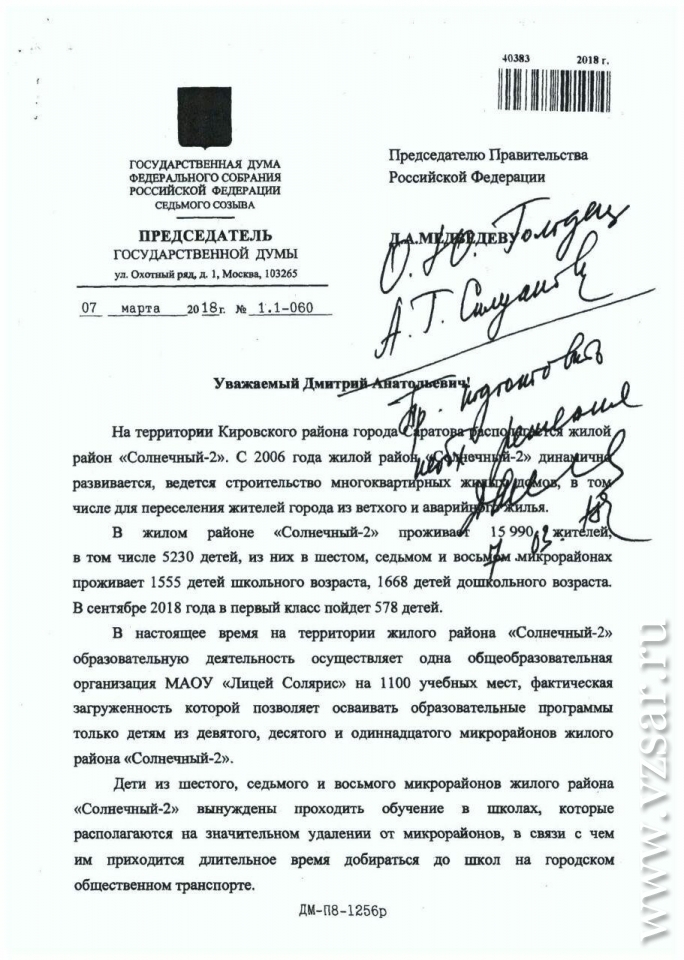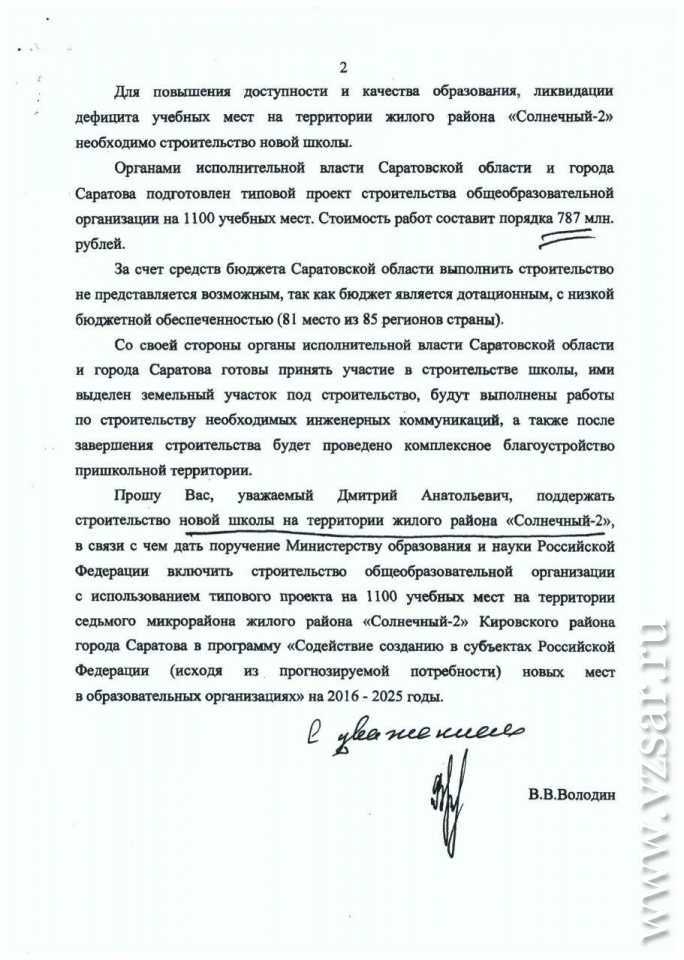 В начале марта Вячеслав Володин обратился к премьер-министру с просьбой поддержать строительство нового общеобразовательного учреждения в Саратове.
