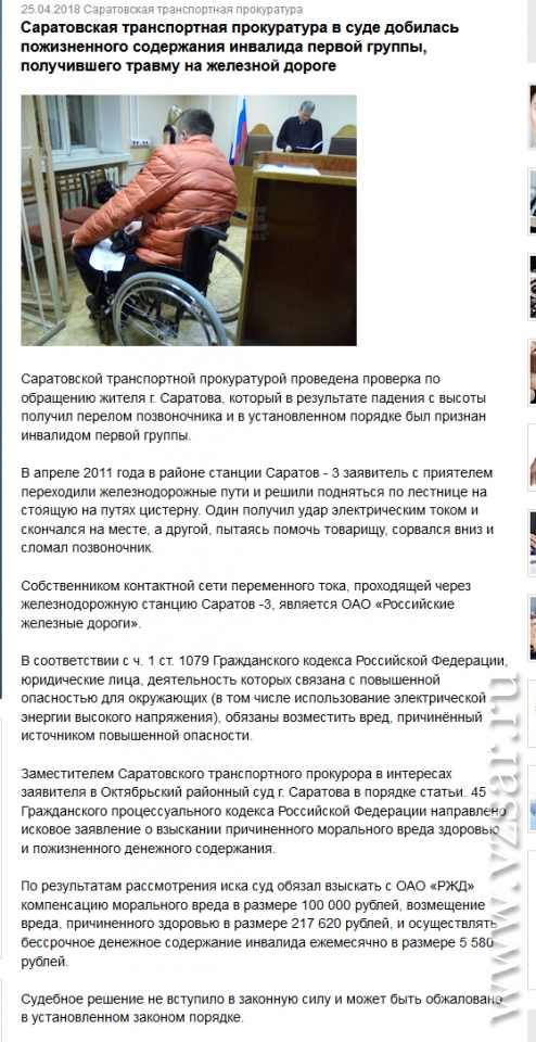 Заместителем Саратовского транспортного прокурора в интересах заявителя в Октябрьский районный суд г. Саратова в порядке статьи. 45 Гражданского процессуального кодекса Российской Федерации направлено исковое заявление о взыскании причиненного морального вреда здоровью и пожизненного денежного содержания.