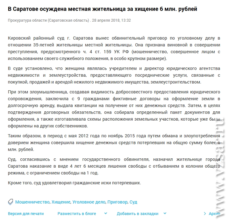 С мая 2012 года по ноябрь 2015 года она похитила больше 6 млн рублей. Ей назначили наказание в виде четырех с половиной лет лишения свободы с отбыванием в колонии общего режима с ограничением свободы на год.