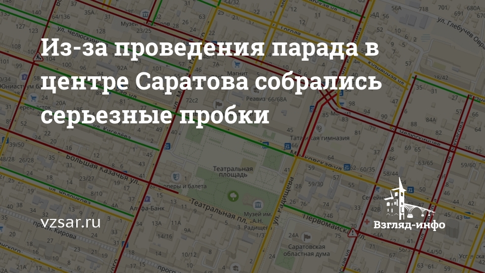 Через полчаса по Театральной площади Саратова начнется прохождение парадных колонн праздничного шествия ко Дню Победы. В связи с перекрытиями в центре города наблюдаются серьезные заторы. Сервис "Яндекс.пробки" оценивает ситуацию в 8 баллов из 10.