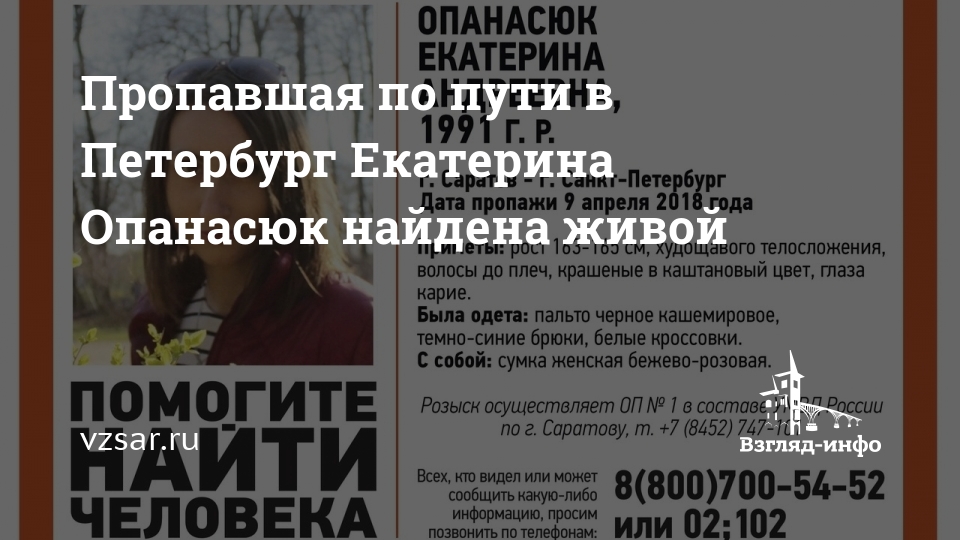 Пропавшая без вести по пути из Саратова в Санкт-Петербург 26-летняя Екатерина Опанасюк найдена живой. Об этом сообщает поисковая группа "Лиза Алерт" в социальной сети "ВКонтакте".