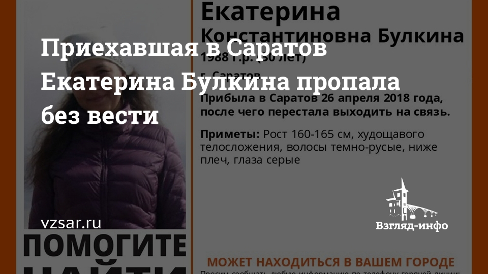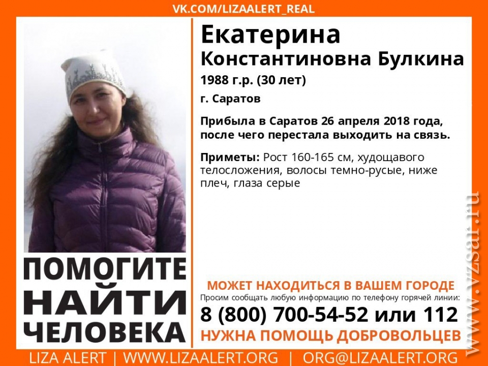 В Саратове разыскивают пропавшую без вести 30-летнюю Екатерину Булкину. Женщина прибыла в наш город из Иркутска 26 апреля и сразу же перестала выходить на связь, сообщают волонтеры сообщества "Лиза Алерт Саратов" в социальной сети "ВКонтакте".