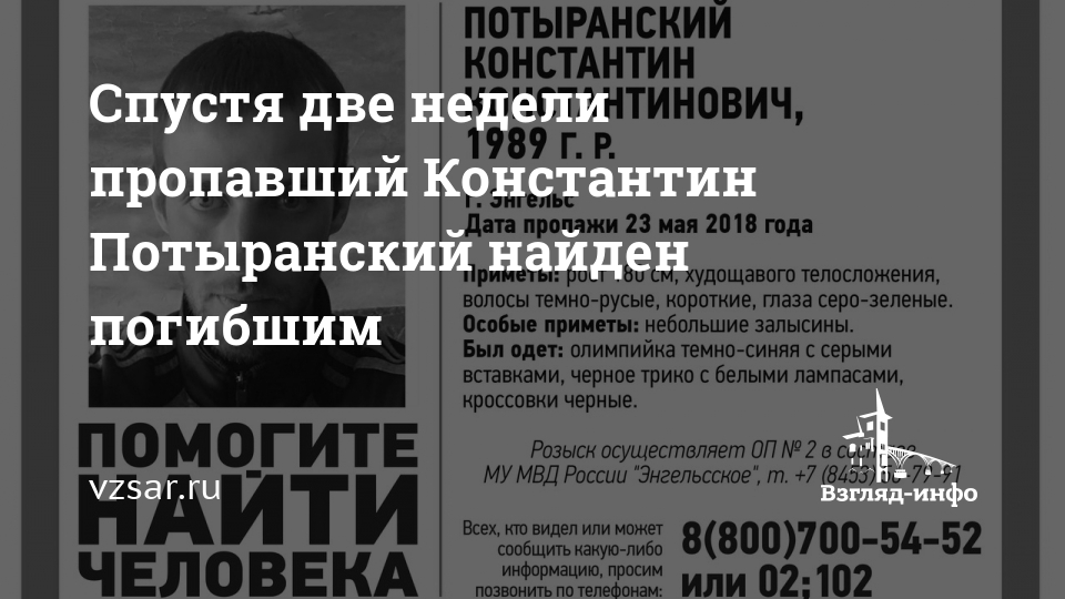 "Найден, погиб Потыранский Константин Константинович, 1989 года рождения. Дата пропажи: 23.05.2018", - сообщают волонтеры.