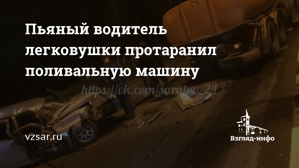 Минувшей ночью в Саратове нетрезвый водитель легкового автомобиля врезался в поливальную машину. Соответствующая информация появилась в сообществе "Саратов онлайн" в социальной сети "ВКонтакте".