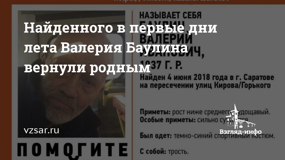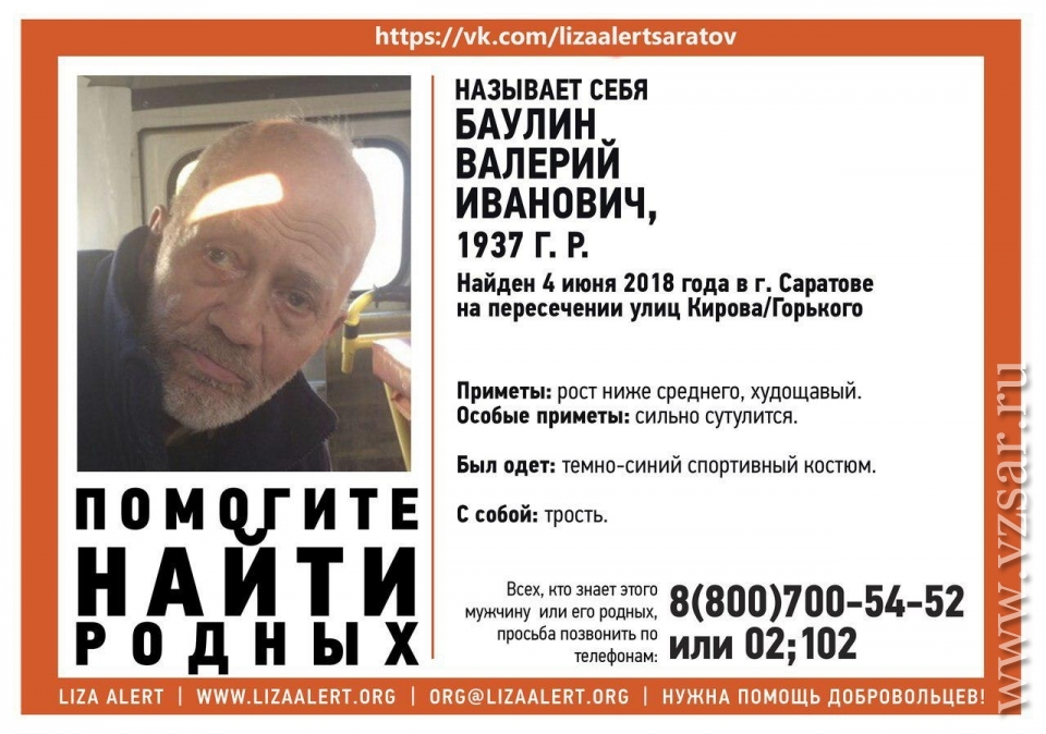 В Саратове волонтеры нашли родственников 81-летнего Валерия Баулина. Об этом сообщает группа поискового отряда “Лиза Алерт Саратов”.