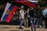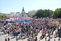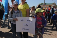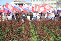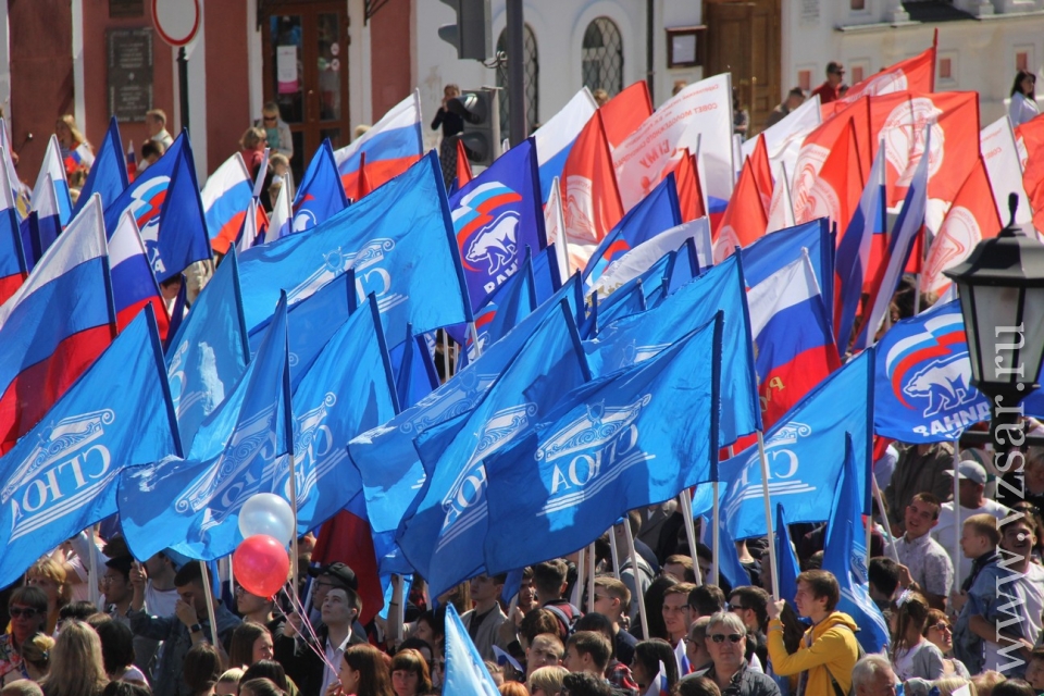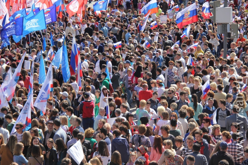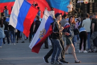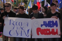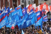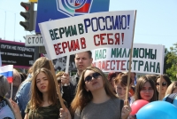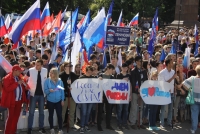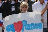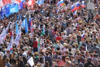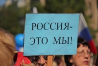 Участники митинга держат плакаты "Россия - это мы", "Россия у нас одна", "Нас миллионы и мы вместе", флаги и баннеры.