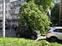 Вероятно, этому помешала линия электропередач, задержавшая падение дерева. Проезд по улице полностью перегорожен.